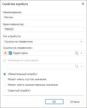 Примечание. В списке атрибутов отображаются только те атрибуты, для которых установлен тип «Ссылка на справочник» и снят флажок «Скрытый атрибут». Подробное описание настройки атрибута приведено в разделе «Свойства атрибута».