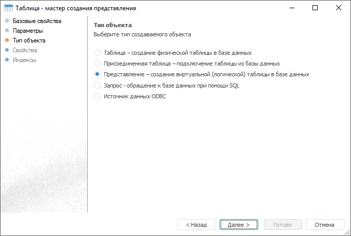 После выполнения одного из действий будет открыт мастер создания представления. Страницы «Базовые свойства» и «Параметры» являются общими при создании любого табличного набора данных. Для получения подробной информации обратитесь к разделу «Работа с мастерами». На странице «Тип объекта» в списке отметьте тип создаваемого объекта - «Представление»: