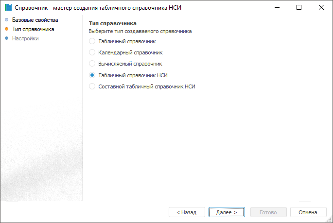 На странице «Тип справочника» определите тип создаваемого справочника. Для этого установите переключатель напротив нужного варианта и нажмите кнопку «Далее». При этом будет осуществлен переход к мастеру создания выбранного типа справочника: