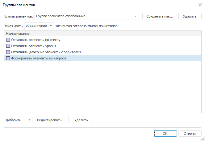 Примитив группы элементов - это набор элементов справочника, сформированный по какому-либо общему признаку.