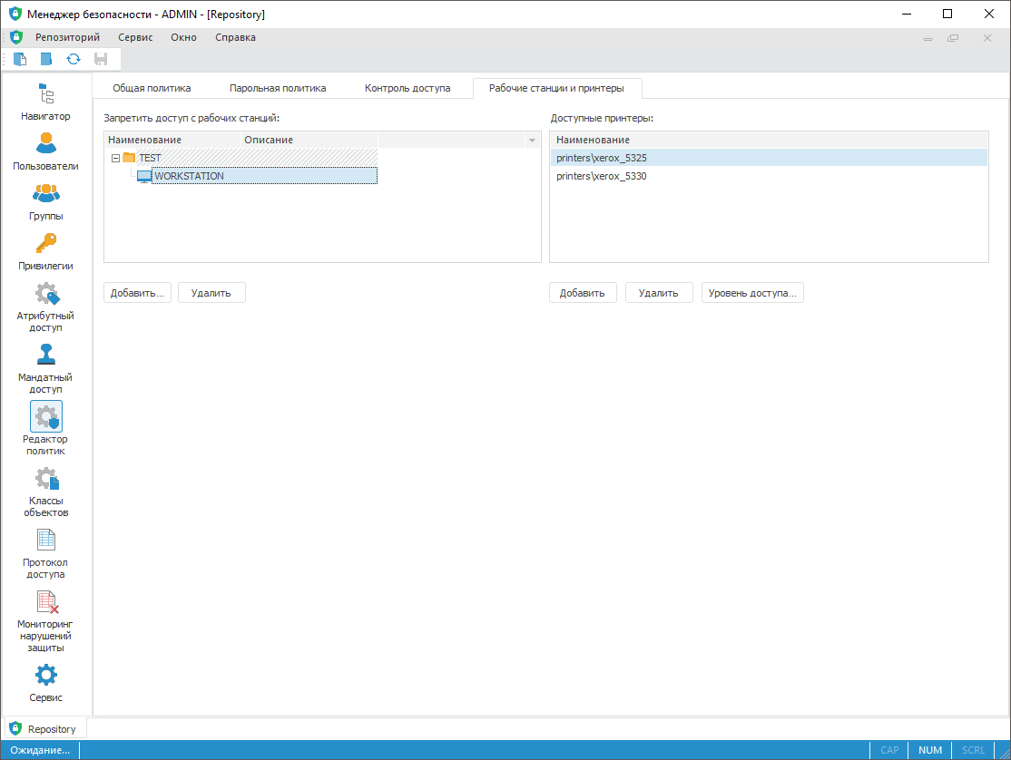Настройка доступных принтеров определяет, на каких принтерах пользователи могут осуществлять печать. Если в области доступных принтеров список пуст, то печать доступна для любых принтеров.