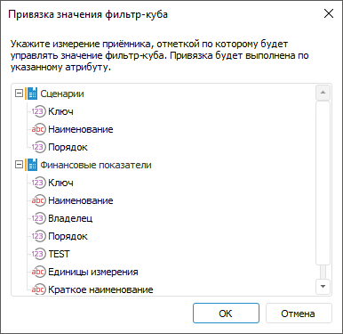 После выполнения действия будет открыто окно «Привязка значения фильтр-куба»: