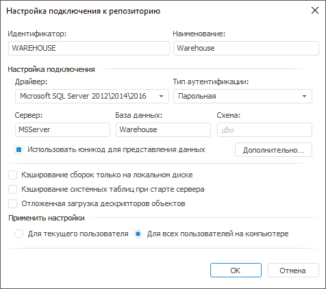 Примечание. При настройке подключения к репозиторию на каждом клиентском компьютере IP-адрес или псевдоним сервера должен совпадать с сервером, указанным при создании служебного пользователя.