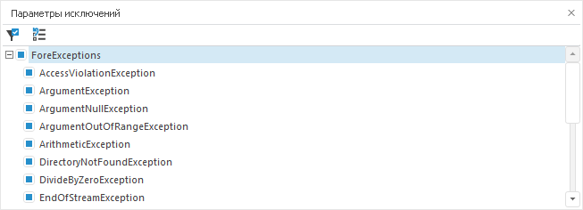 Окно «Параметры исключений» предназначено для выбора исключительных ситуаций, возникновение которых будет приводить к остановке выполнения программы и переходу в режим отладки: