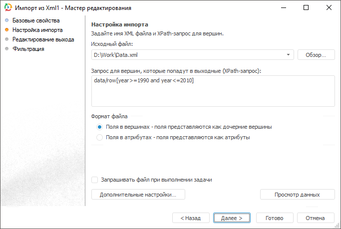 Примечание. Формат запроса зависит от структуры используемого файла. Более подробную информацию о формировании XPath-запросов можно найти в дополнительной документации, например в MSDN.