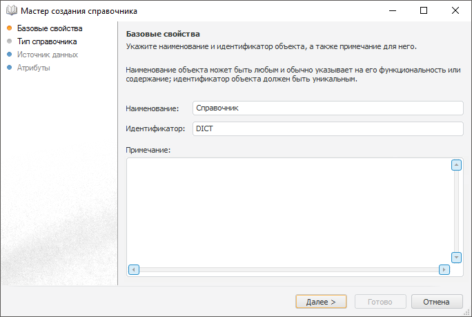 На странице «Базовые свойства» задается наименование объекта, идентификатор и примечание.