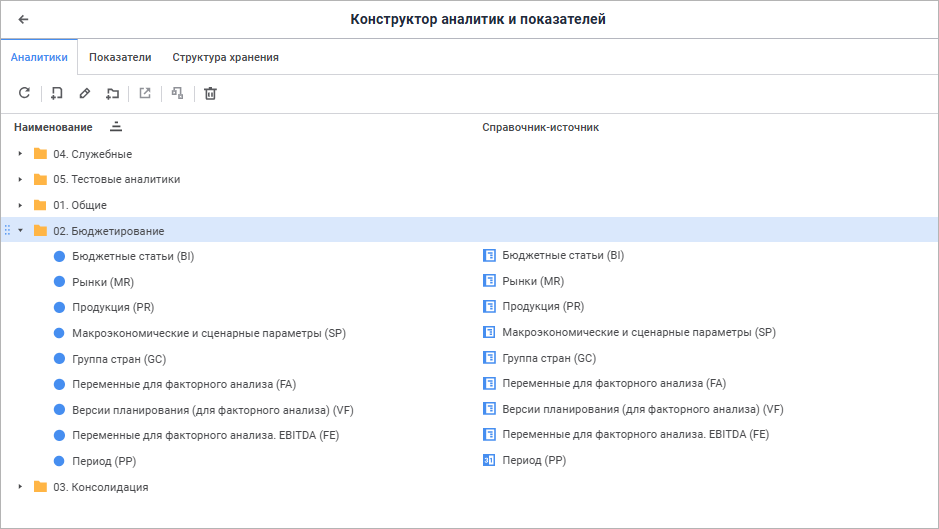 Для работы с аналитиками модели данных используйте вкладку «Аналитики» конструктора аналитик и показателей.