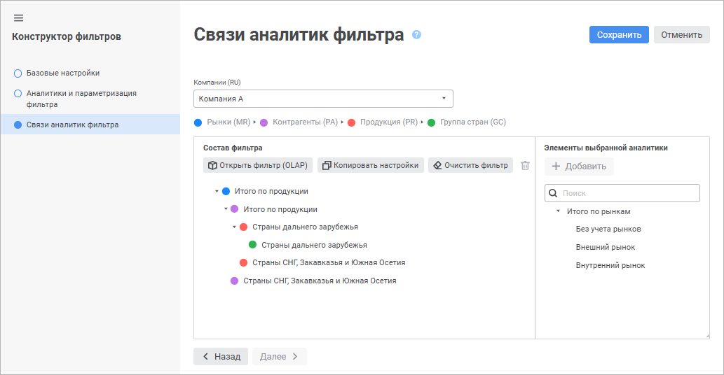 В области «Состав фильтра» будет сформирована иерархия элементов аналитик, соответствующая выбранному элементу основного параметра.