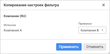 Выберите в раскрывающемся списке значение параметра фильтра, заданного на странице «Аналитики и параметризация фильтра», для которого будет формироваться вариант боковика бюджетной формы. Для выбранного значения состав фильтра будет пуст. Для заполнения состава фильтра на основе состава для других значений используется операция копирования настроек.
