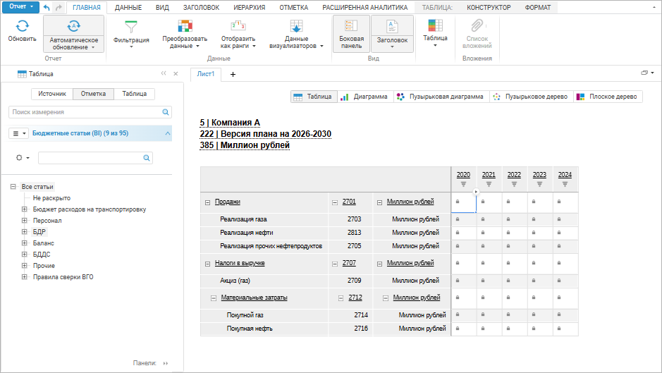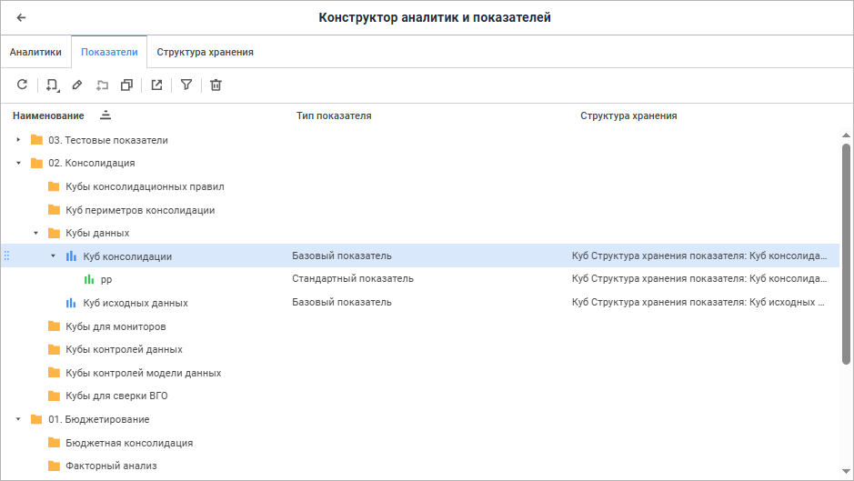Для работы с показателями бюджетной модели используйте вкладку «Показатели» конструктора аналитик и показателей.