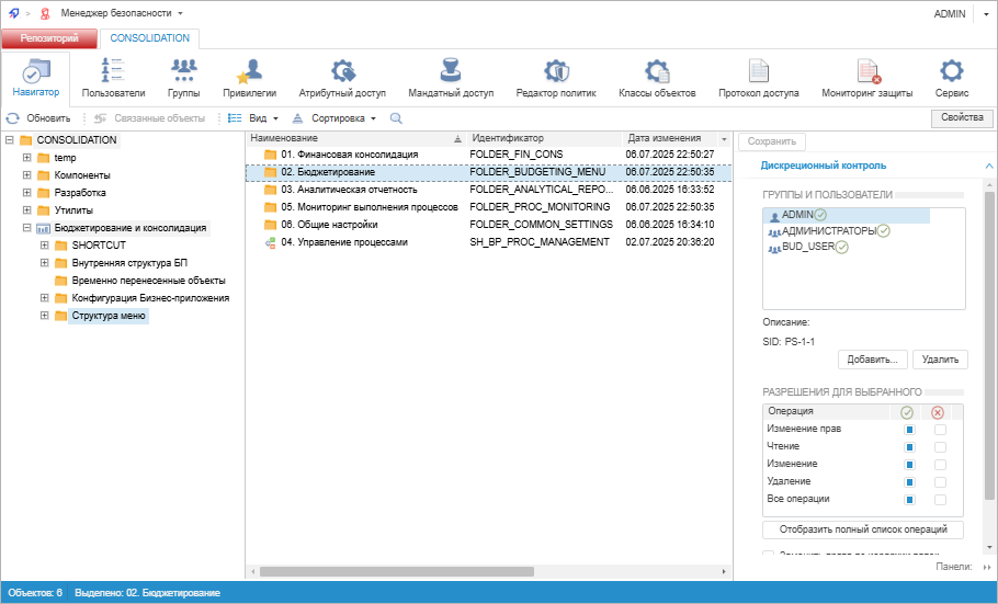 Для настройки прав доступа к объектам продукта «Форсайт. Бюджетирование и консолидация» используйте раздел «Навигатор» на панели навигации в инструменте «Менеджер безопасности» продукта «Форсайт. Аналитическая платформа»: