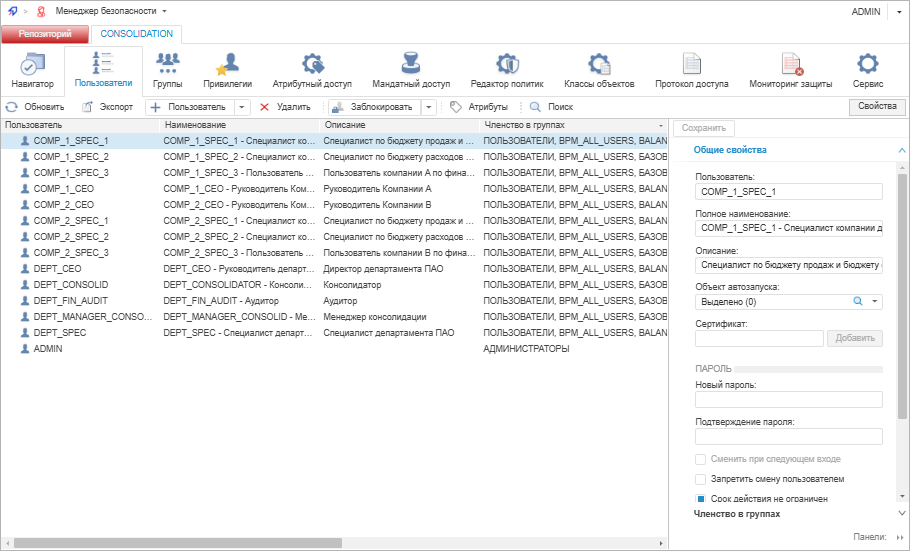 Для создания учётных записей пользователей продукта «Форсайт. Бюджетирование и консолидация» используйте раздел «Пользователи» на панели навигации в инструменте «Менеджер безопасности» продукта «Форсайт. Аналитическая платформа»: