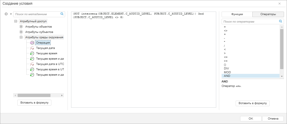 выберите значение операции для доступа к элементам справочника в раскрывающемся списке «Значение»: OPERATION=1048576. Целевое условие «OPERATION=1048576» определяет действие правила на операцию чтения данных объекта;
