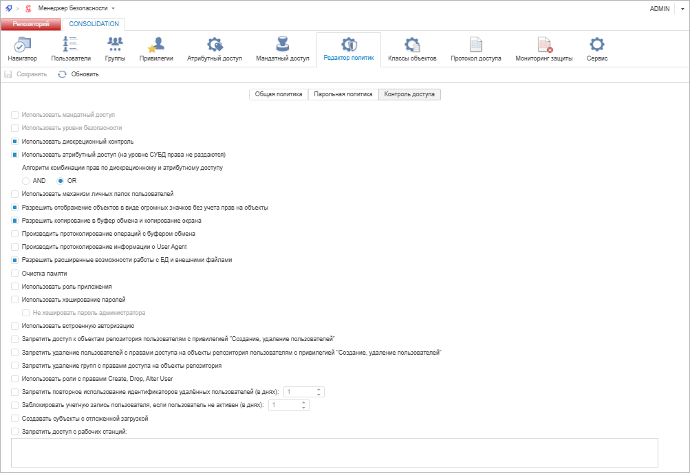 Выбор метода разграничения доступа выполняется в разделе «Редактор политик» инструмента «Менеджер безопасности» продукта «Форсайт. Аналитическая платформа».