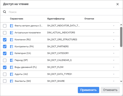 В описании статических сегментов приведён пример, когда всем пользователям по умолчанию могут быть даны права только на чтение ко всему объёму данных структуры хранения. Динамические сегменты позволяют в рамках выполнения шагов процесса предоставить доступ определённым функциональным группам пользователей, отвечающим за соответствующие шаги процесса, на изменение данных по определённому срезу с учётом передачи параметров процесса, например, на изменение данных структуры хранения по определенным версии планирования и плановому периоду.