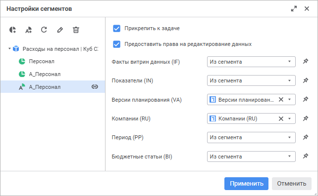 Сегменты данных представляют собой срезы кубов, зафиксированные по определённым аналитикам. Сегменты позволяют ограничивать доступ к срезам данных для групп пользователей.