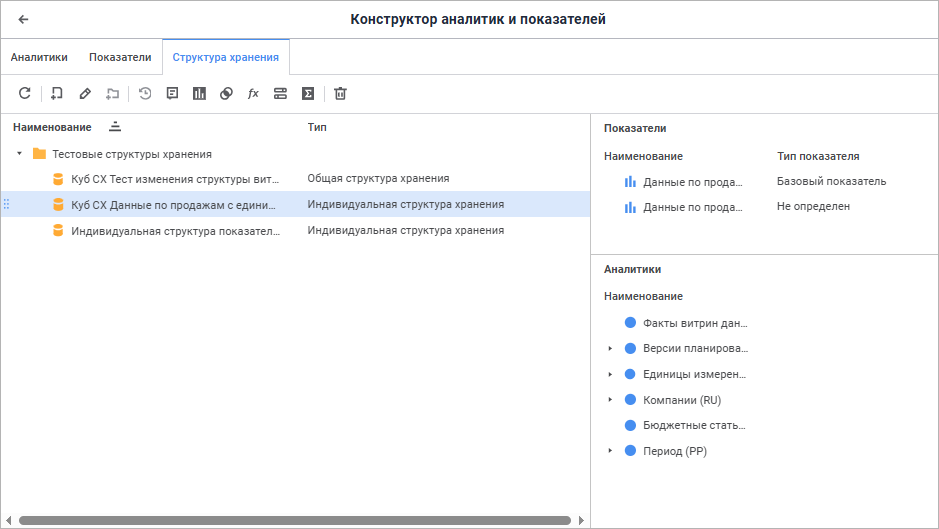 Для работы со структурами хранения используйте вкладку «Структуры хранения» конструктора аналитик и показателей.