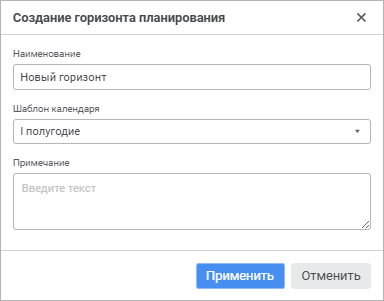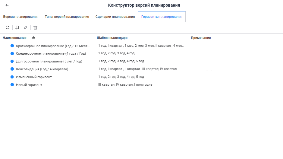 Для работы с горизонтами планирования используйте вкладку «Горизонты планирования» конструктора версий планирования.