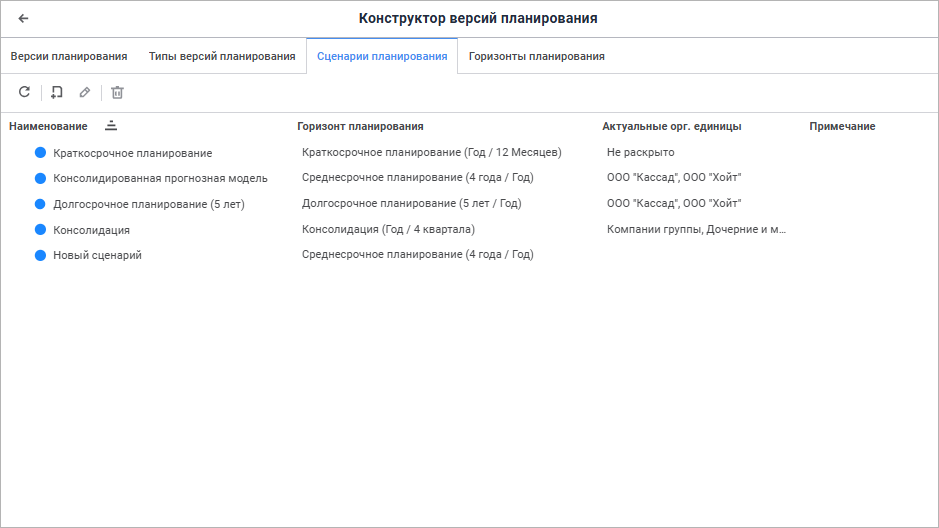 Для работы со сценариями планирования используйте вкладку «Сценарии планирования» конструктора версий планирования.