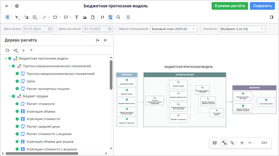 конструирование расчётной модели в едином рабочем пространстве путем создания цепочки расчётных блоков и блоков агрегации данных;