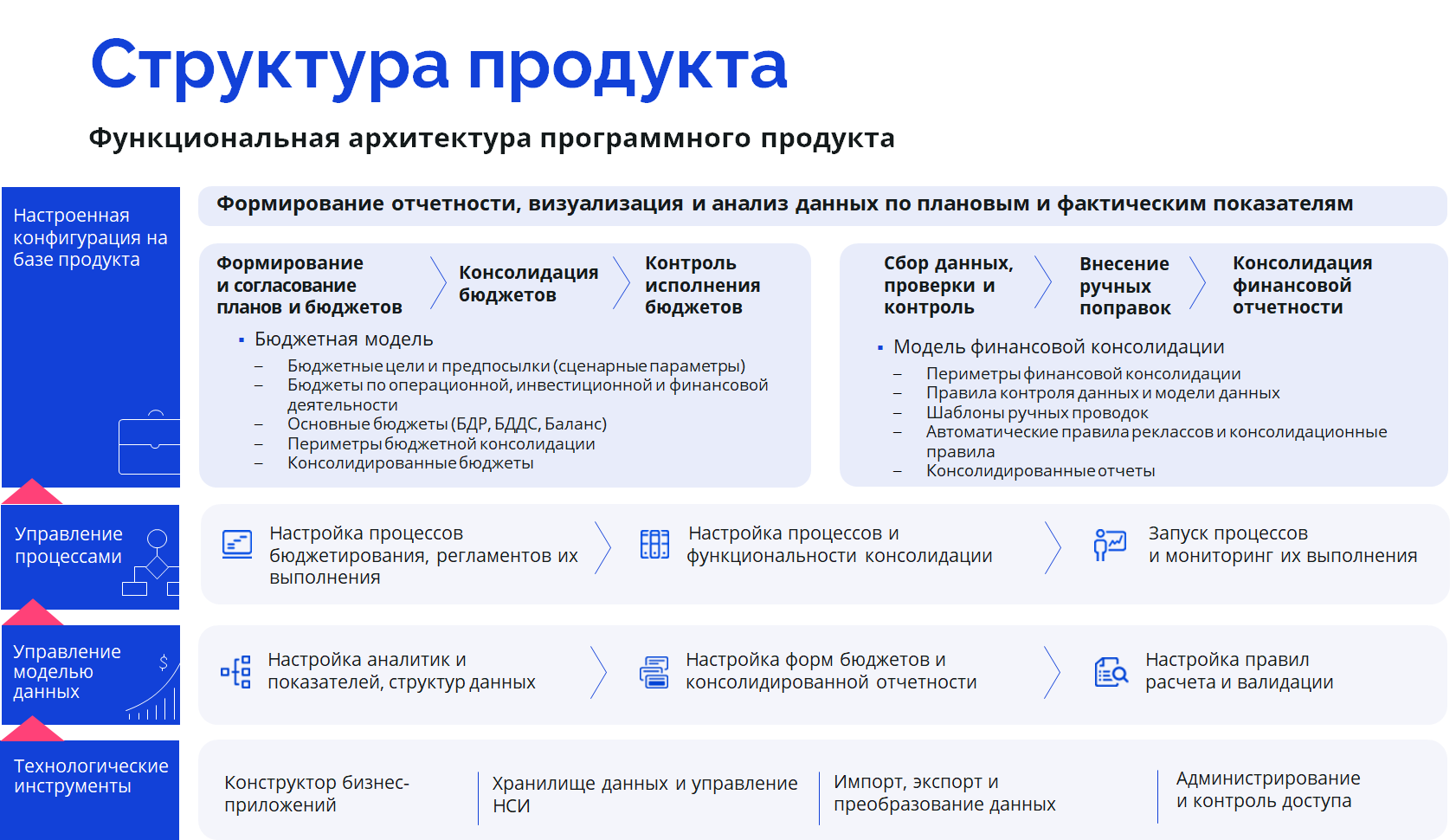 Функциональная архитектура программного продукта основана на инструментах продукта «Форсайт. Аналитическая платформа» и содержит конфигурацию объектов, позволяющую в короткие сроки адаптировать продукт для решения поставленных задач бюджетирования и консолидации.
