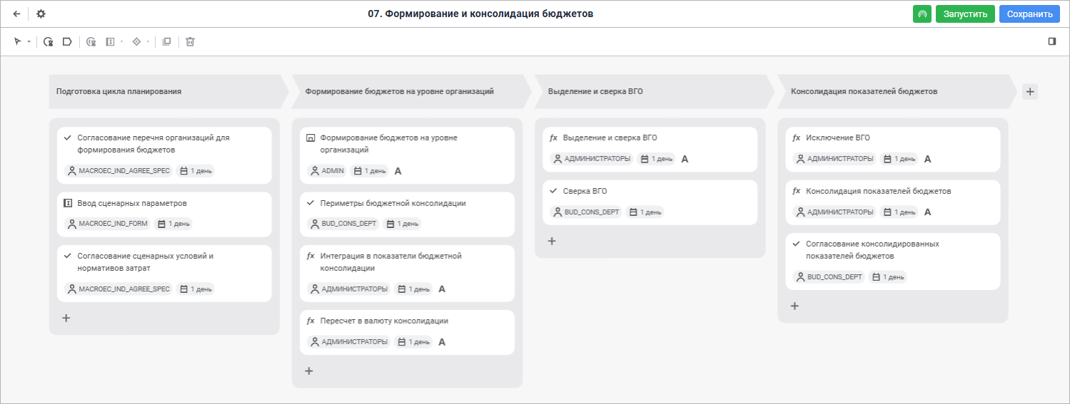 связь шагов процесса с операциями ввода, расчёта, контроля и согласования бюджетных показателей;