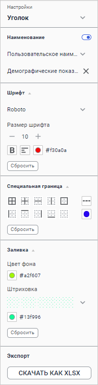 если в шапке или боковике таблицы несколько измерений, то при выборе «Пользовательское наименование» ячейки уголка объединяются в одну. Ранее введённые наименования уголка будут сброшены;