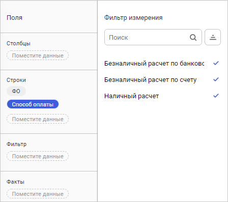 Для задания факта перетащите требуемый факт в поле «Поместите данные» области «Факты» группы «Поля» с помощью механизма Drag&Drop.