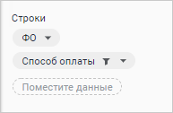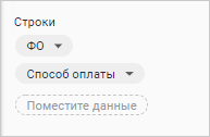 Для задания строк/столбцов перетащите требуемые измерения и/или факты в поле «Поместите данные» области «Строки»/«Столбцы» группы «Поля» с помощью механизма Drag&Drop. В результате в списке строк/столбцов будут отображаться добавленные измерения и/или факты: