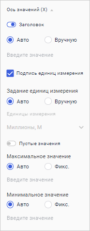 Пустые значения. Настройте отображение значений оси. По умолчанию переключатель неактивен и значения оси отображаются. При неактивном переключателе доступны настройки максимального и минимального значений, в которых выберите способ задания значений: