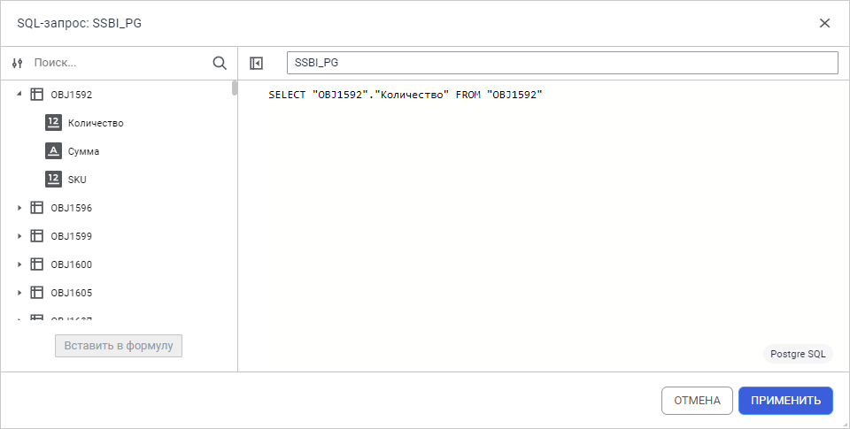 Сформируйте текст запроса на языке SQL в области формул окна.