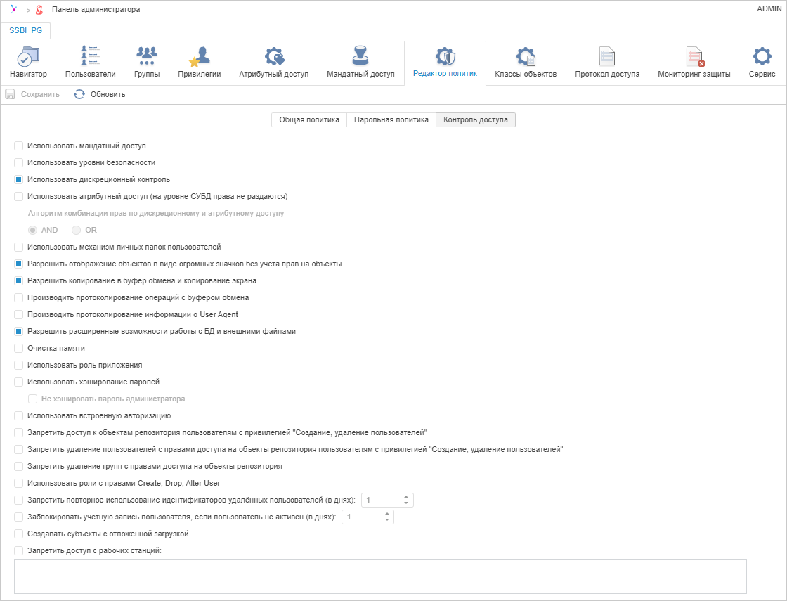 Для управления методами разграничения доступа используйте вкладку «Контроль доступа» в разделе «Редактор политик» панели навигации.