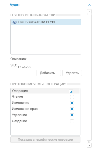 Примечание. Настройка аудита по специфическим операциям доступна типам объектов, для которых предусмотрены специфические операции. Для разных типов объектов список специфических операций отличается.