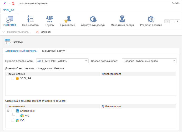 После выполнения действий отобразятся вкладки «Дискреционный контроль» и «Мандатный доступ» для выбранного объекта.