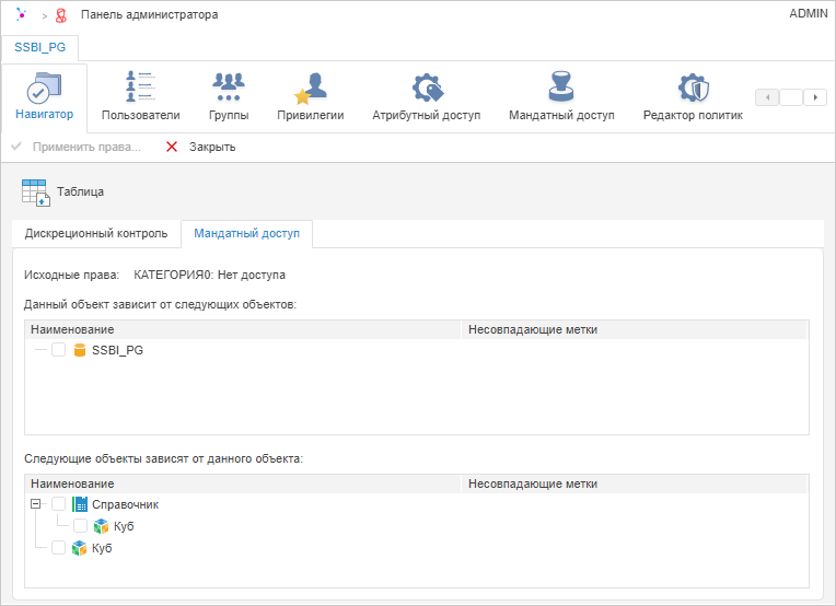 Несовпадающие метки. В столбце выводятся метки безопасности объекта, несовпадающие с метками исходного объекта, в формате «<наименование категории>: <наименование уровня>».