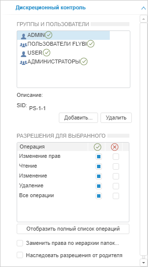 Примечание. При установленном флажке права родителя, отличающиеся от прав дочернего объекта, в диалоге прав для дочернего объекта отображены не будут. Для просмотра наследуемых прав перейдите на вкладку «Эффективные права».
