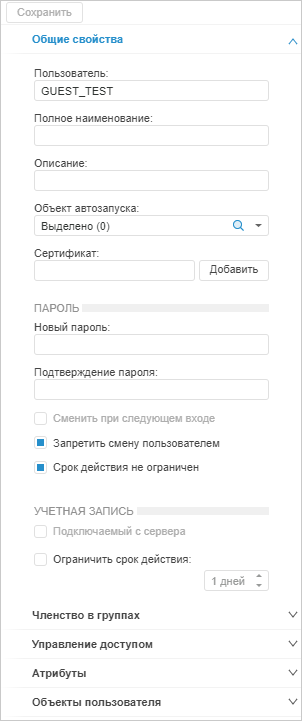 Выберите пользователя в разделе «Пользователи». Будет открыта боковая панель «Свойства»: