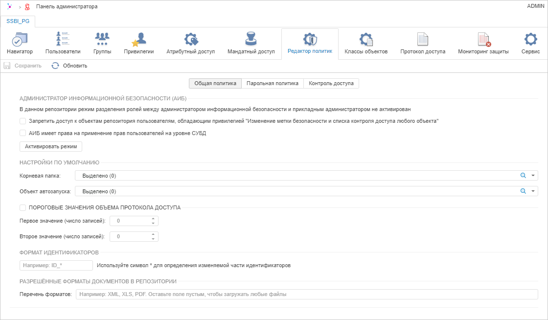 Общая политика включает в себя: разделение ролей администраторов, настройки по умолчанию, пороговые значения объема протокола доступа, формат идентификаторов для объектов репозитория, ограничение загрузки документов в репозиторий, контроль версий объектов при обновлении.