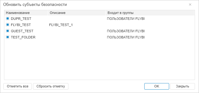Сформируется список пользователей в окне «Обновить субъекты безопасности», в который попадают: