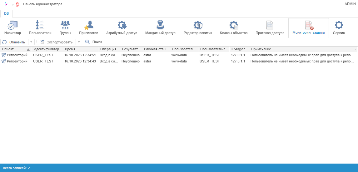 Примечание. При разделении ролей между администратором информационной безопасности и прикладным администратором раздел «Мониторинг нарушений защиты» будет доступен только администратору информационной безопасности.