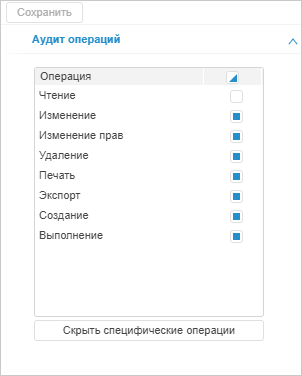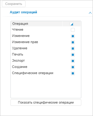 Для настройки аудита по специфическим операциям нажмите кнопку «Показать специфические операции» на вкладке «Аудит». В списке аудита операций дополнительно отобразятся специфические операции на боковой панели «Свойства»: