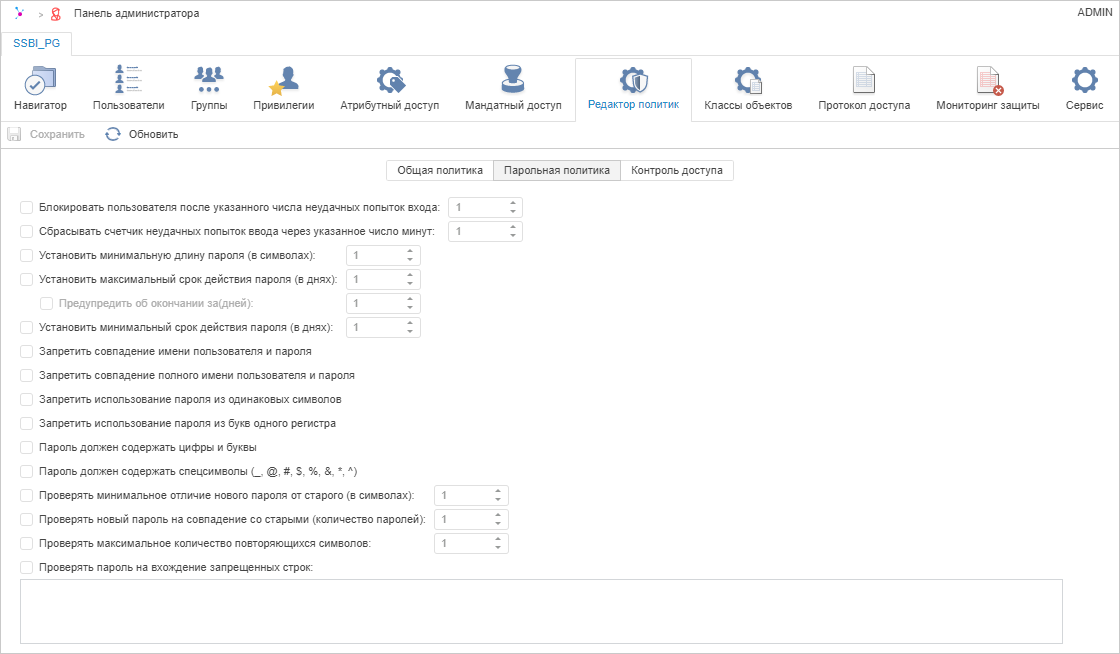 Для настройки проверки паролей пользователей используйте вкладку «Парольная политика» в разделе «Редактор политик» панели навигации.