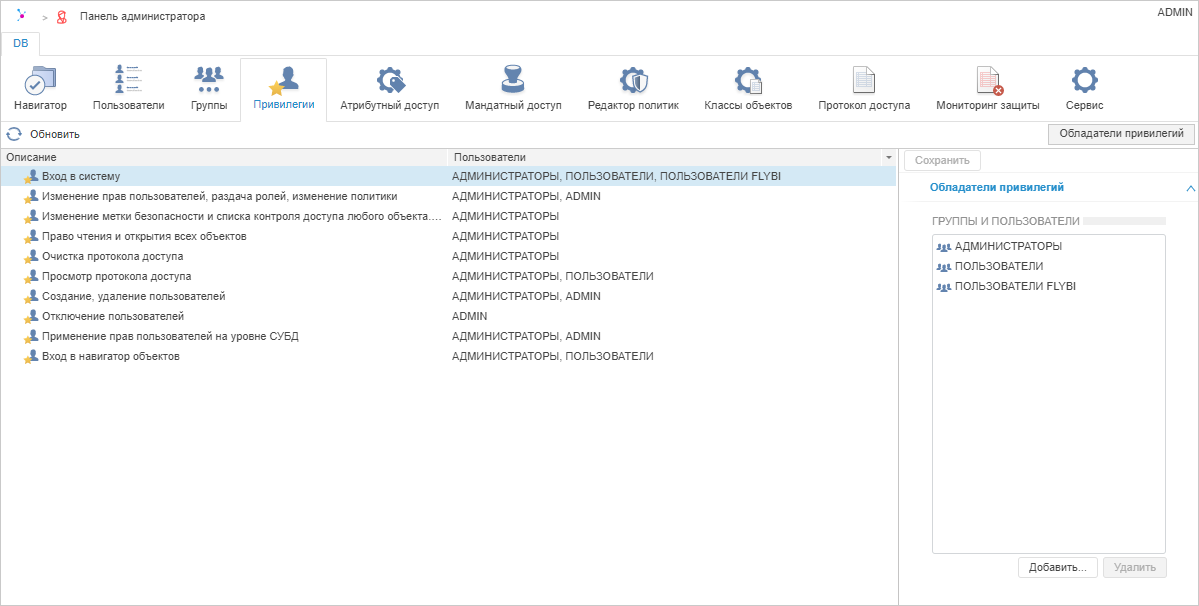 Для удаления обладателей привилегии выделите требуемых пользователей или группы пользователей из списка «Группы и пользователи» на боковой панели и нажмите кнопку «Удалить».