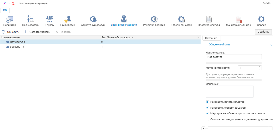 Примечание. При разделении ролей между администратором информационной безопасности и прикладным администратором раздел «Уровни безопасности» будет доступен только администратору информационной безопасности.