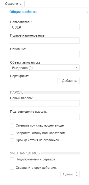 Для изменения параметров общих свойств пользователя используйте вкладку «Общие свойства» на боковой панели «Свойства»: