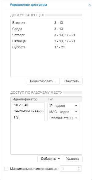 По умолчанию пользователю разрешен доступ в систему в любое время, с любых рабочих станций, IP и MAC-адресов.