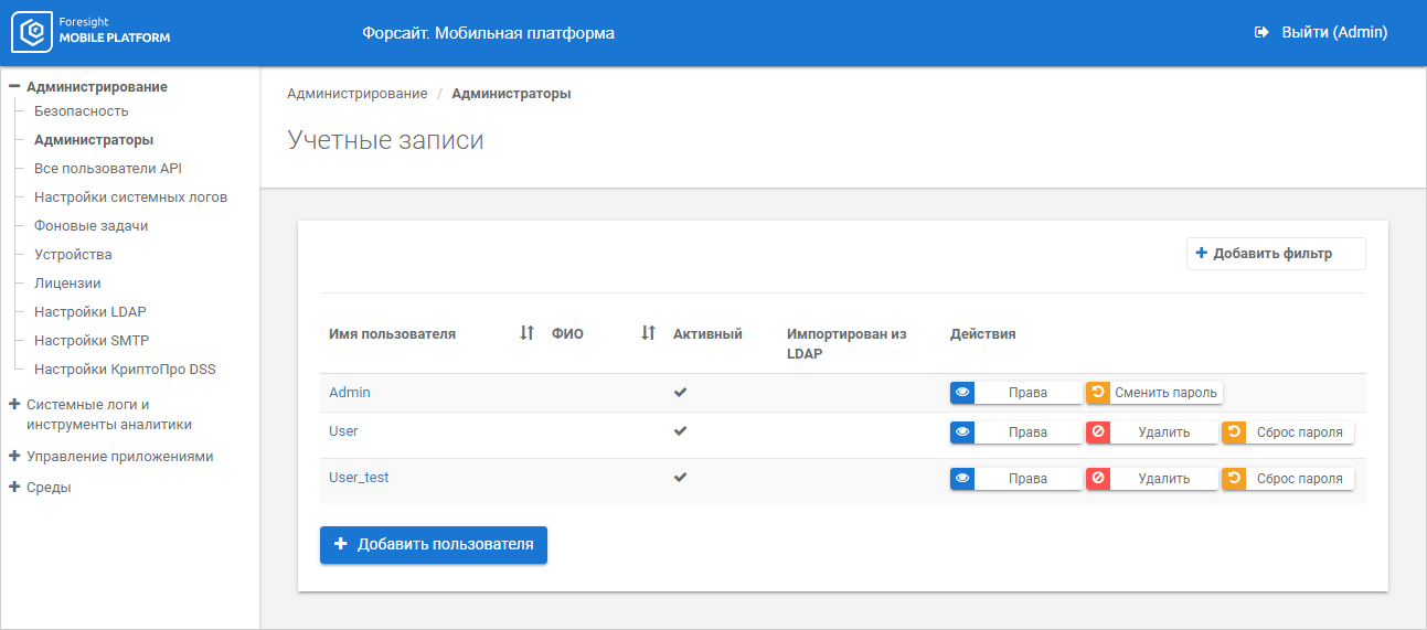 Administrators can use several access control options applied at the same time. By default, the "superuser" administrator account is created with the password "superuser", who has full access to system.