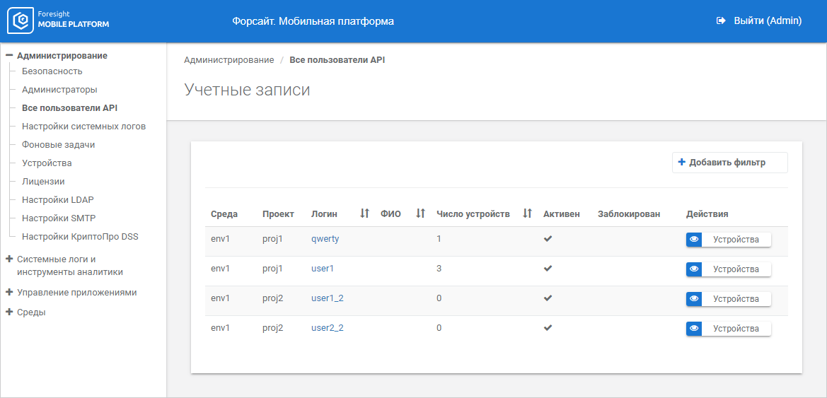 The working area displays names of environments and projects, to which API user belongs, and the number of linked devices.