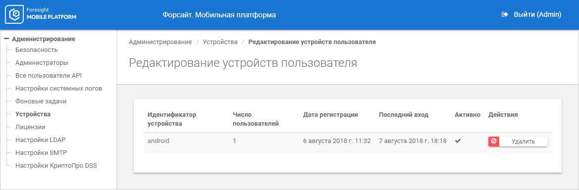 After executing the operation the list of user linked devices opens: