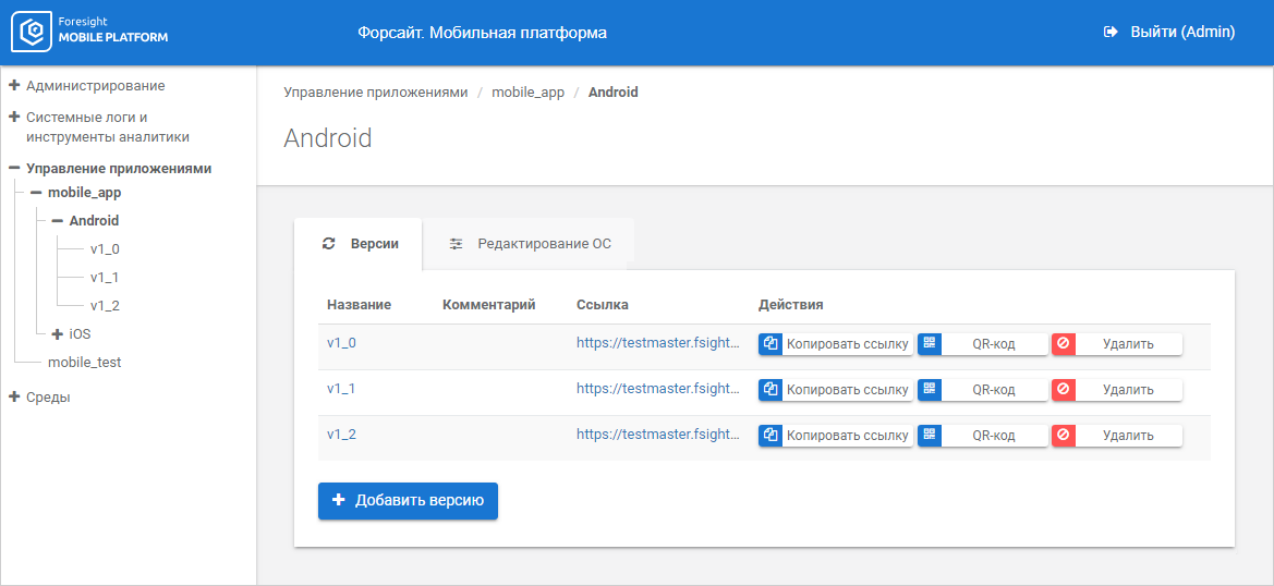 After executing the operations the application distribution file version is added to the versions list, and a direct link to application distribution file download is generated as text and QR code.
